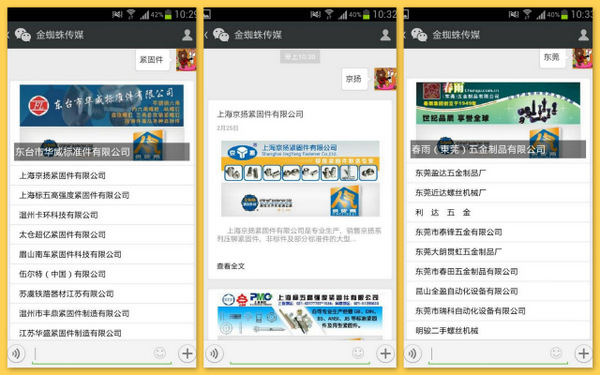 1. 發(fā)送“緊固件”、“鉚釘”、“五金”、“螺絲”、“螺母”、“機(jī)械”、“設(shè)備”、“模具”等關(guān)鍵詞到金蜘蛛微信,將會(huì)自動(dòng)獲取相應(yīng)公司名中有關(guān)該關(guān)鍵詞的供貨商。