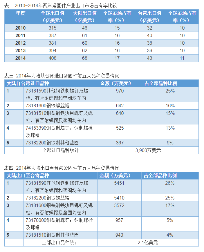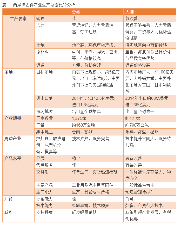 大陸與臺灣有競爭也有合作的關系,早年臺灣廠商看好大陸低廉的生產要素價格而進入市場,大陸緊固件廠早年亦依賴臺灣的模具生產;而后期則演變至看好大陸從世界工廠變成世界市場,嗅到進入大陸市場強大的內需,外資又在大陸投資活躍,有機會讓臺商進入國際大廠供應鏈,大陸更可借此合作機會切磋產業技術。