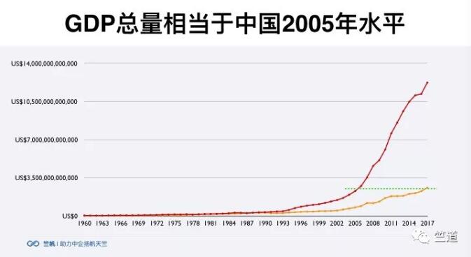 但是放大來看,看整個(gè)經(jīng)濟(jì)總量,紅色線條代表中國(guó),黃色線條代表印度,印度的GDP總量只有中國(guó)2005年的規(guī)模。
