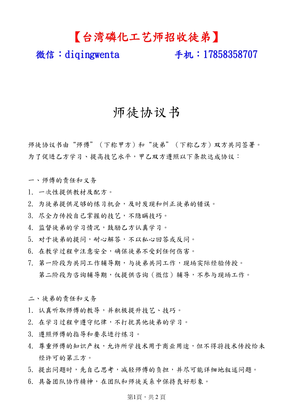 臺灣磷化工藝管理師招收徒弟