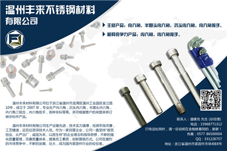 成立日期:1995年8月16日 員工人數:54 注冊資本(元):200萬元 年營業額(元):200萬元 溫州豐來緊固件有限公司(原名豐來材料有限公司)位于浙江省溫州市龍灣區溫州工業園區金江路10號,成立于1995年,專業生產內六角,沉頭內六角,半圓頭內六角,內六角三組合,內六角扳手,各種非標等等。并可根據客戶的來圖來樣訂做非標件產品。 溫州豐來材料有限公司生產設備先進,技術實力雄厚,檢測手段完善,工藝精湛,近百位資深技術人員。作為一家民營企業,公司一直堅持"艱苦創業、從嚴治廠,誠信為本、以質生存"的企業理念和指導思想,不斷的強化質量管理,完善質量體系,提高員工素質,創新營銷方式。公司在激烈的市場競爭中,不斷的發展、壯大,成為國內緊固件行業的佼佼者。